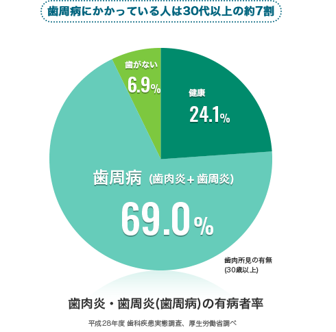 痛みなどの自覚症状がなく進行するので、別名サイレント・ディジーズ(沈黙の病気)と呼ばれ、症状が進行すると歯を支える骨(歯槽骨)を溶かし、やがて歯が抜けてしまう原因になります。